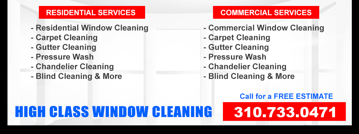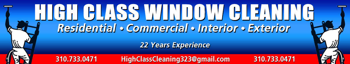 With over 22 years of experience in window cleaning, there is no job too big or too small for us too handle. We realize there are many different buildings which call for many different needs. Free estimates are available, If there may be any questions or if more information is needed about services or rates please call us anytime at 310-733-0471 or leave a message and someone will get back to you as promptly as possible. In order to gain a thorough understanding of your specific needs, a HIGH CLASS CLEANING staff member will meet with you onsite and then provide a free estimate. |